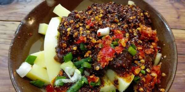 一、制作食材:綠豆、鹽、糖、辣椒、花生油、蒜末、香醋、生抽、食用堿、蔥花、花生碎。