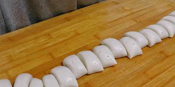 3、面團發好之後,揉搓排氣,搓成長條,切成16個小劑子。