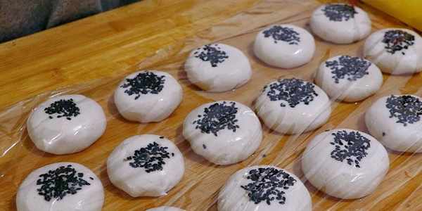 5、全部包好之後放在案板上,蓋上保鮮膜二次餳發5分鐘,餳發到輕飄飄、胖乎乎的就可以瞭,這樣更軟糯好吃。案板上可以撒一點幹面粉,或刷一層油,防止餅子粘案板。