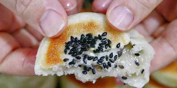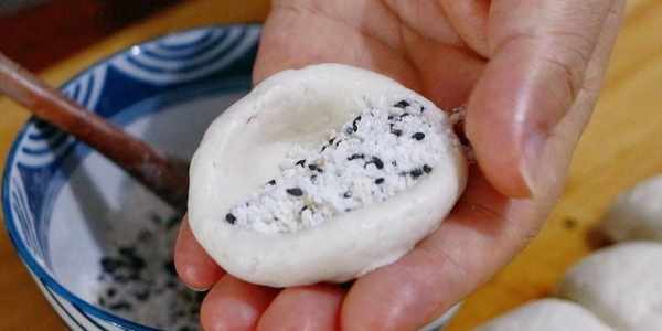 4、取一個小劑子,揉圓,捏出一個窩窩,中間放上適量糖餡,用虎口收攏,收口處捏結實防止漏糖,包好後按扁,再撒一點黑芝麻壓結實。