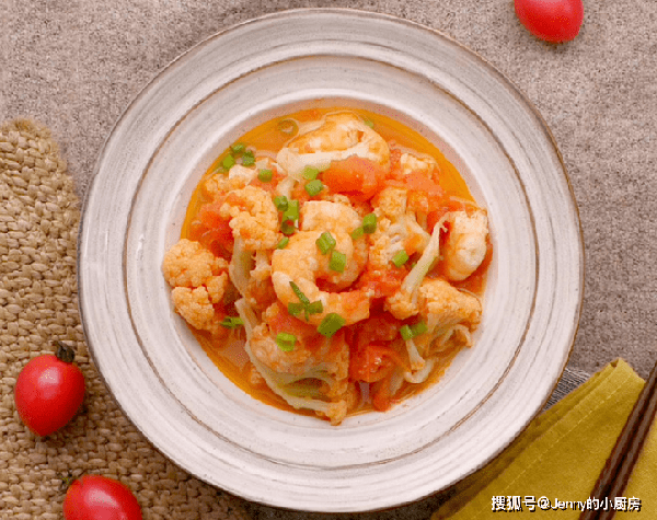 番茄清洗幹凈,劃上十字,放進鍋內煮一兩分鐘,再將外皮去掉,切成小塊。花菜分成小朵,清洗兩三遍,瀝幹水分。