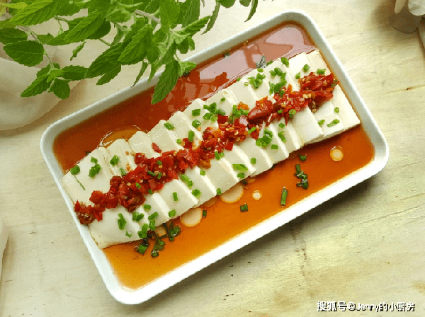 準備一塊豆腐,老嫩都可以,沖洗一下切成小塊,放進盤內擺好。