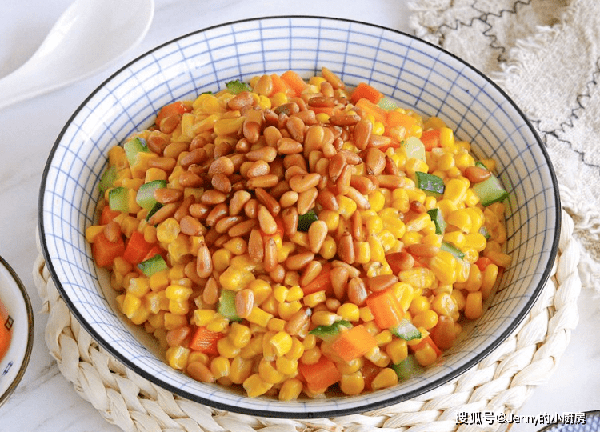 留底油,倒入玉米粒、胡蘿卜丁、黃瓜丁翻炒一分鐘,再加入少許鹽、白糖翻炒均勻。