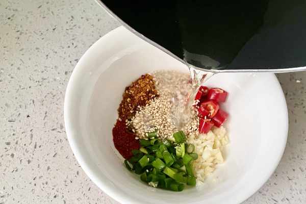 3、碗中放入小米椒圈,蔥花,蒜末,白芝麻,辣椒面,辣椒粉,拌勻