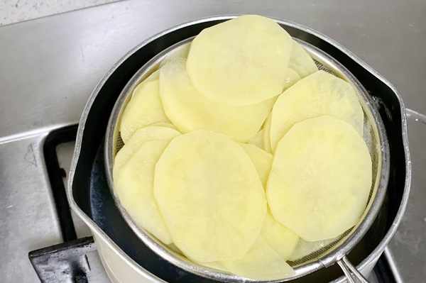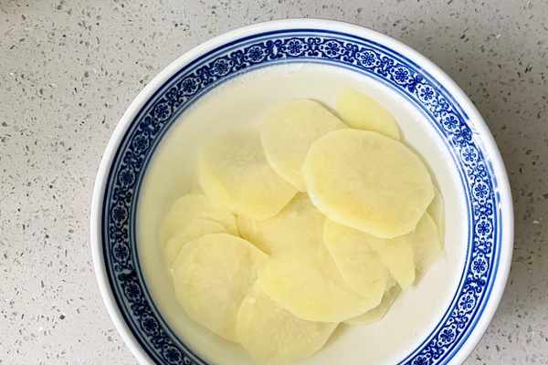 1、土豆去皮切成薄片,下沸水煮2分鐘