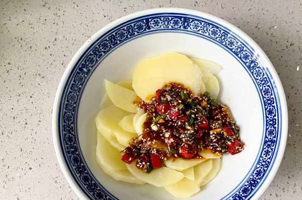 6、在土豆片中澆入涼拌汁,拌勻即可
