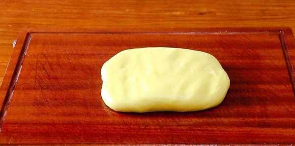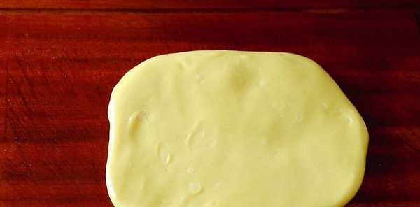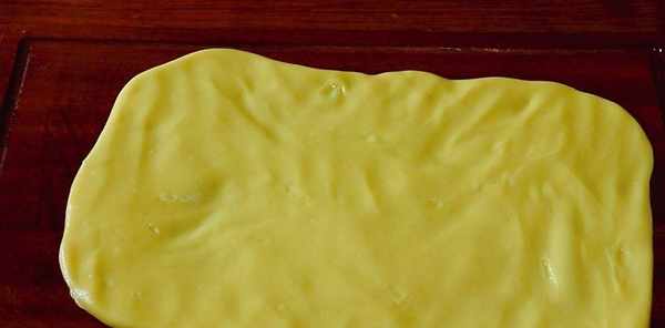 案板上抹上一點油,把揉好的黃米面團放入案板上,用搟面杖搟成長方形的片狀。