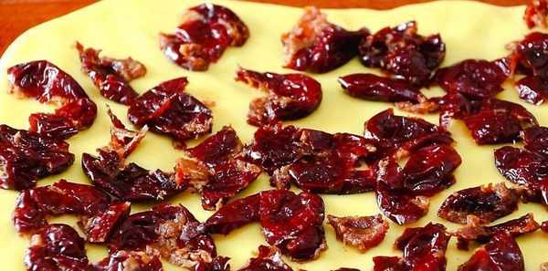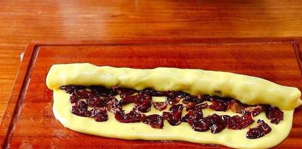 把去瞭核兒的棗子平鋪在上面。將皮子卷起來,卷成一個卷。