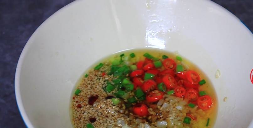 第六步、接下來咱們做一個萬能料汁,碗裡加入蒜末、小米辣、蔥花,再來一勺白芝麻,用熱油潑一下激發出香味,接下來開始調味,加入兩勺生抽,兩勺香醋,一勺食鹽,一勺雞精,一勺香油,兩勺油潑辣子,攪拌均勻後就可以瞭。