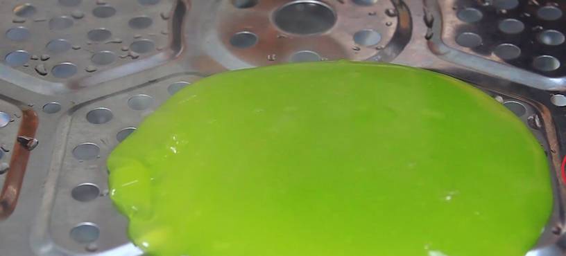 第五步、提前準備一盆清水,上面鋪上篦子,用勺子將淀粉糊放到篦子上,用勺子底壓一壓,這樣一個個漏魚就做好瞭,而且非常非常快速。
