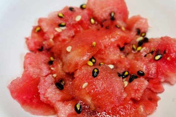 2、將西瓜裡的紅瓤全部用勺子挖出,挖得小塊兒一點薄一點,方便去瓜子;然後將紅瓤內的瓜子悉數挑出,乳白色的嫩子也要盡量剔除幹凈。