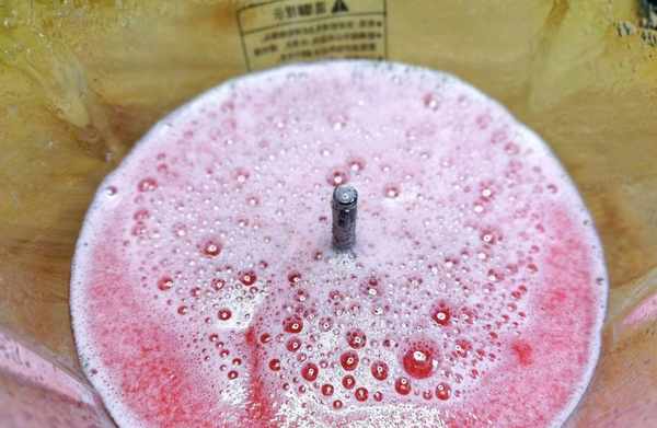 3、把挑幹凈的西瓜紅瓤連同碗底滲出的湯汁一起全部倒入攪拌機裡,開最大檔打成西瓜汁;粉紅色的西瓜汁在開蓋的瞬間清香味撲面而來,忍住不要喝,繼續下個步驟。
