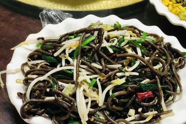 菜品二:炒紅薯面條紅薯很多朋友都吃過,但紅薯面條估計聽說過的人都不會太多吧?但是,如果是曾經生活在六七十年代的人,肯定對於紅薯面條不陌生,因為在以前的災荒年間,很多人都是靠著紅薯面條度日的。現在紅薯面條搖身一變成為瞭農傢樂必點的菜品之一,基本上每桌都會點上一盤,非常的暢銷!紅薯面條吃起來帶著紅薯的淡淡甜味兒,口感有點黏,配上辣椒、豆芽、韭菜簡單一炒,香味十足!