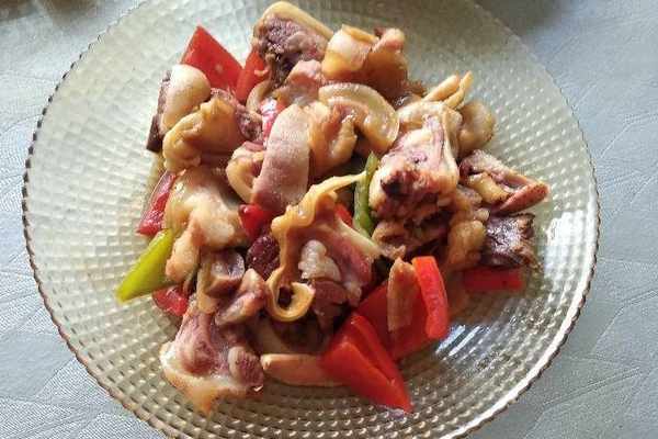 羊臉用白水烀的爛熟,然後切成厚一點的片,搭配上尖椒簡單一炒,尖椒的清香微辣正好可以解瞭羊臉的膩,羊臉吃起來咸香彈牙,跟啤酒可以說是絕配。