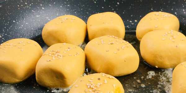 5.整理完後頂部撒上一層薄薄的白芝麻,鍋燒熱加入一小片黃油融化,再下入面餅開小火慢煎,中間要不斷的翻動保證6個面都均勻受熱。