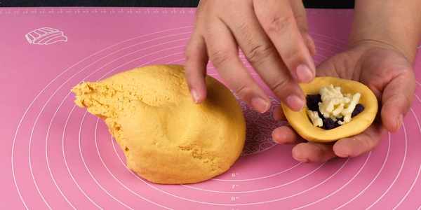 4.取南瓜面團一小團,按壓整理成圓窩形,放入調好的紫薯餡加上一點兒馬蘇裡拉芝士碎,再捏合攏按壓成這樣的形狀。
