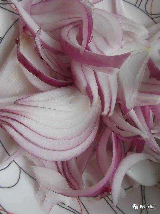 2、紫皮洋蔥半個,洋蔥是做羊肉菜不可少的一味調料,非常的香,先從中間先分成兩層,然後再切成粗細均勻的長條。