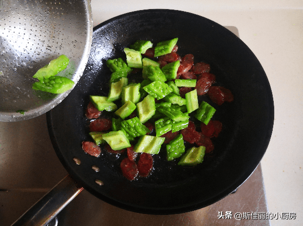 3. 加入焯好的苦瓜片進鍋翻炒幾下;