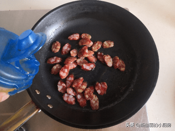 2. 燒熱鍋中,放入少許油和水, 用水將臘腸片燜熟; 再微微煎出臘腸片中的油脂,這時因為臘腸沒有提前蒸制;