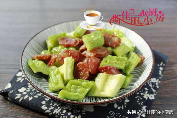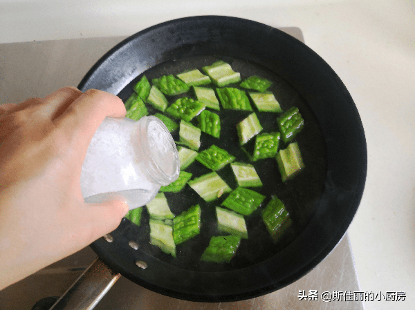 制作:1. 將苦瓜切開,再去掉裡面的瓤, 切成菱形片備用; 燒鍋水加入少許鹽和幾滴油, 將苦瓜放進鍋中焯煮至變色後撈出,這樣能去除苦瓜中大部分的苦味;