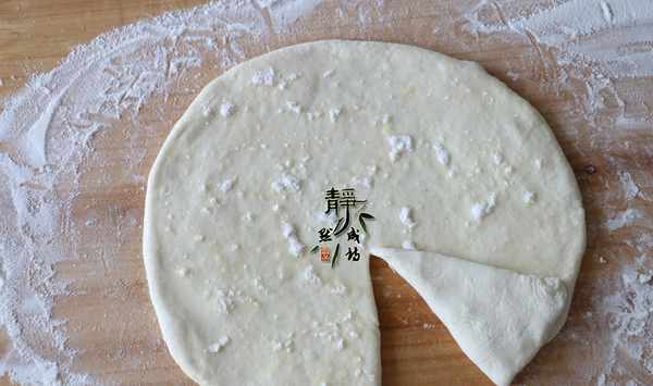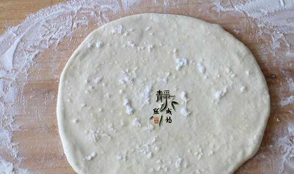 5、輕輕搟開,刷油、撒鹽、撒面粉。
