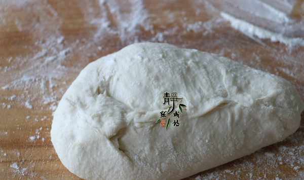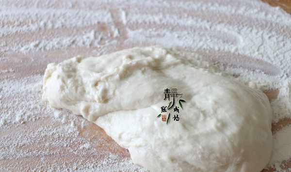 3、面團餳好以後,揪一塊兒面團,把它放在撒瞭幹面粉的案板上。