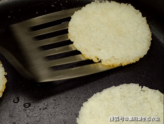 2、鍋中倒油放入攪拌好的米飯,平鋪小火煎至金黃