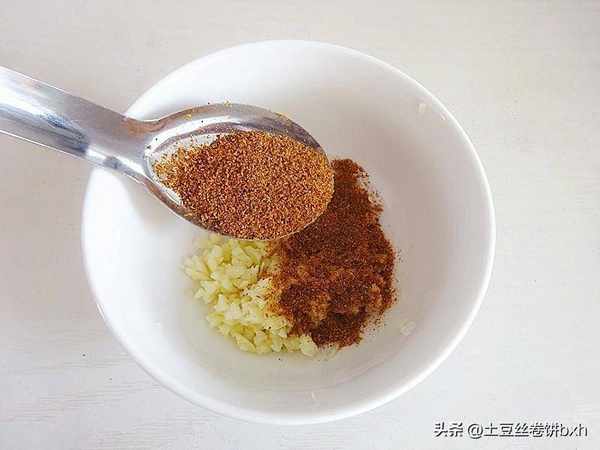 3、在烤茄子的時候我們兌調味料。我今天兌的是一根茄子的量,做的多倍增就可以。把大蒜剁碎,放入一勺混合燒烤粉。燒烤粉就是用鹽、熟芝麻粉、辣椒粉、孜然粉混合好的,超市裡都有售賣,自帶咸味的。