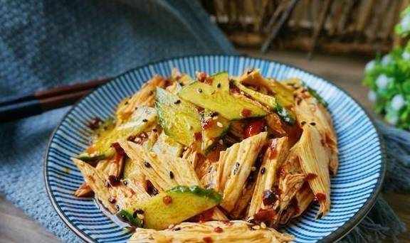 2.將腐竹斜刀切段。黃瓜切片。
