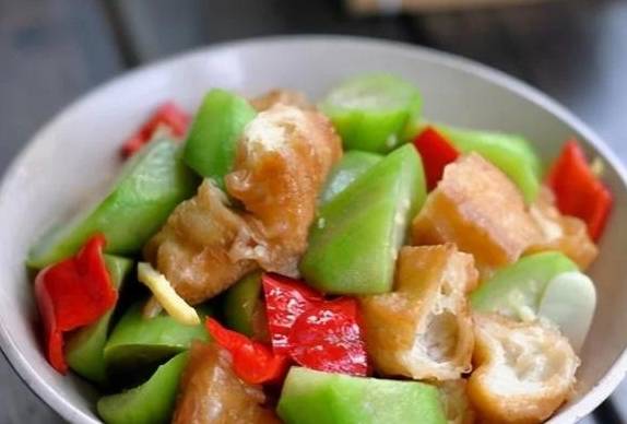 5、倒入切好的油條段,絲瓜塊稍翻炒。