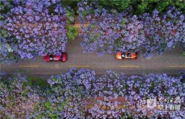 近段時間的春城街頭,絢爛的藍花楹競相盛開,微風過處,花瓣翩翩,讓人仿佛進入一個夢幻世界。
