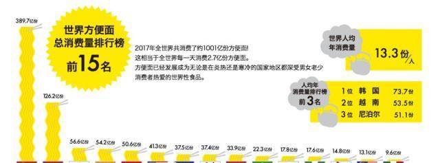 自從方便面發明至今,年銷量一直處於上升勢頭中。到瞭2017年,全世界共消費瞭1001億份方便面,這相當於每個人都吃瞭15包方便面。無論是沙漠中的阿拉伯國傢,還是雨林中的熱帶國傢,北到雪國,南至大海,都對這款食品表示歡迎。