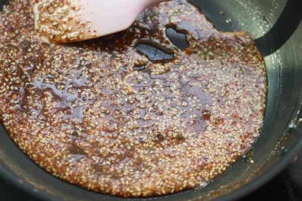 用刮刀或鏟子挑起,能掛到鏟子上!這時候放入怪味調料!