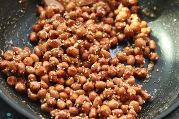 最小火,繼續不停的炒。越炒越會粘,接著在鍋邊會出現糖霜。繼續翻炒,不要停!炒著炒著,明顯感覺花生會越來越幹澀! 直到炒幹,顆粒分明的時候就可以!如果第5步,糖液沒有熬濃稠,就放瞭調料和花生,那這一步就要費點時間炒瞭,直到炒幹為止!
