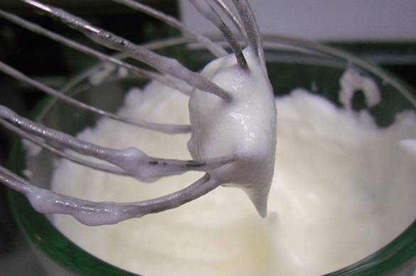 打發至中性發泡,此時蛋白要凝固,提起攪拌頭,泡沫成略彎的圓錐狀