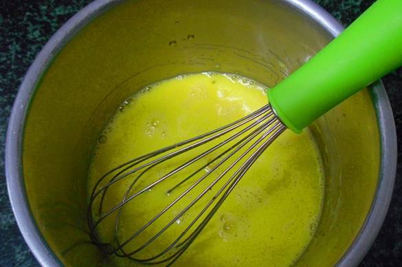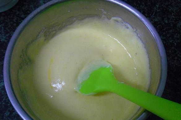 蛋黃中加入另一半白糖,牛奶、玉米胚芽油