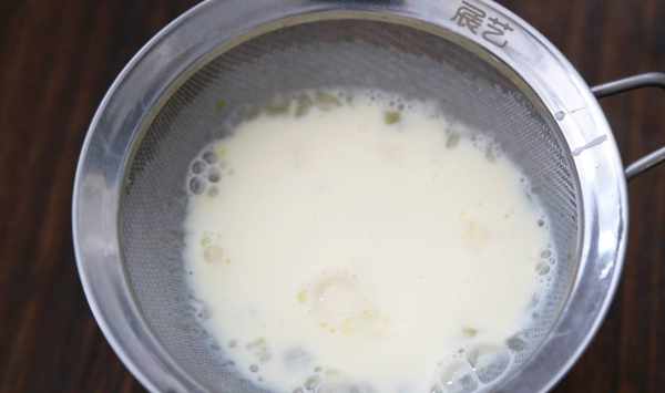 第二步,將攪拌好的蛋液用篩網過濾一遍,這樣做出來的蛋撻口感上會更加細膩一些。