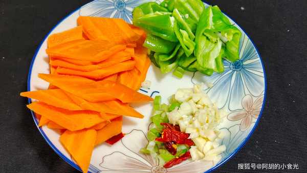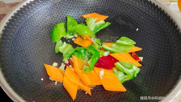 第四步:鍋裡燒油,加入蔥蒜和幹辣椒炒出香味,接著將青椒塊,胡蘿卜片下鍋炒至斷生。