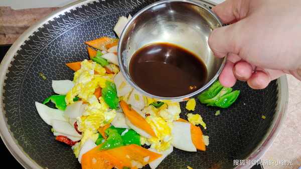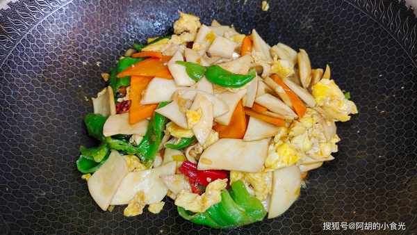 第五步:倒入控幹水份的杏鮑菇片,開大火翻炒均勻,再將炒熟的雞蛋下鍋,翻炒幾下,緊接著將調好的碗汁淋入鍋內,大火快速翻炒均勻就可以出鍋瞭。