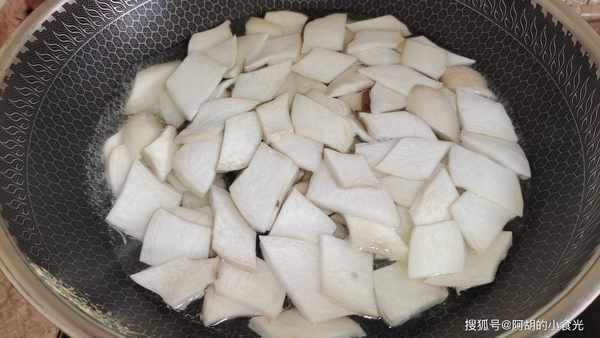 第一步:杏鮑菇洗幹凈後切成菱形片,註意此處的杏鮑菇不要挑選那些傘蓋打開的,因為口感不佳,而後將切片的杏鮑菇開水下鍋焯燙1分鐘,撈出後控幹水份備用。