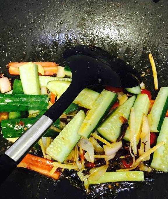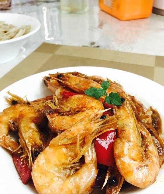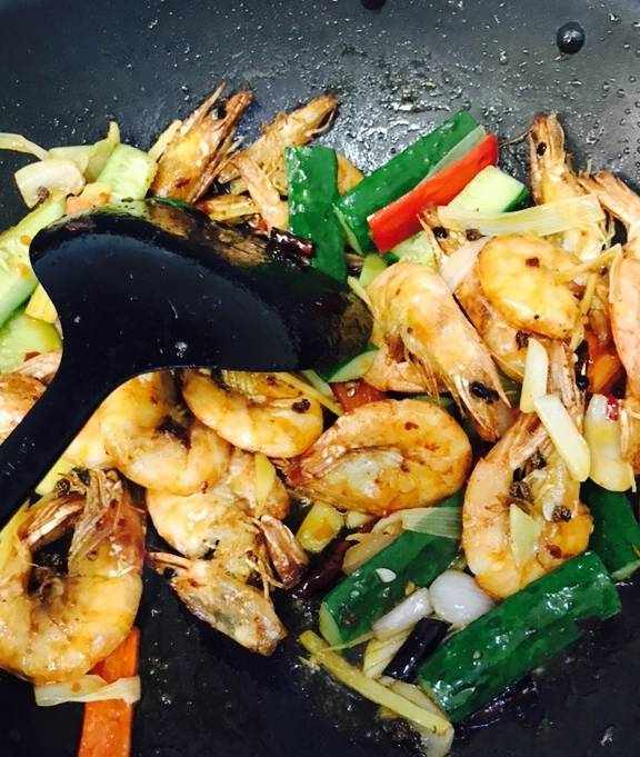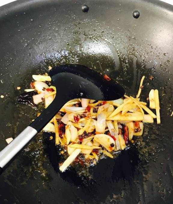 3.剛才油炸對蝦的油留少許,繼續小火燒熱後,放入花椒和幹辣椒炒香,然後放入薑絲和大蔥大蒜還有半勺豆瓣醬一起翻炒均勻