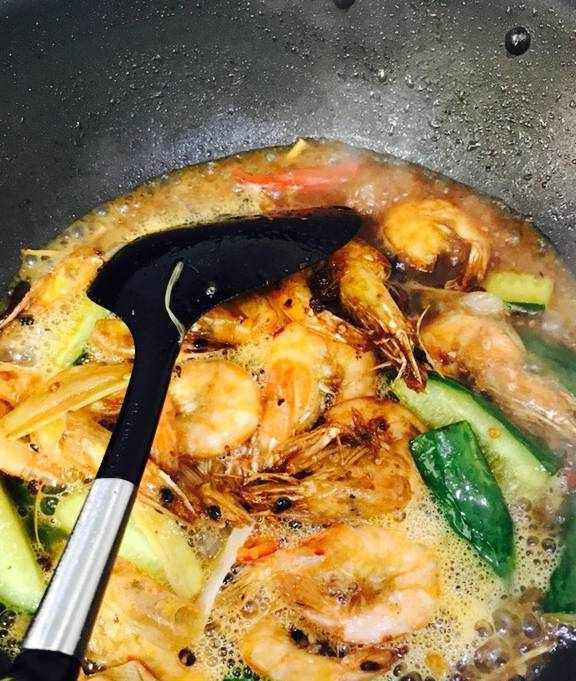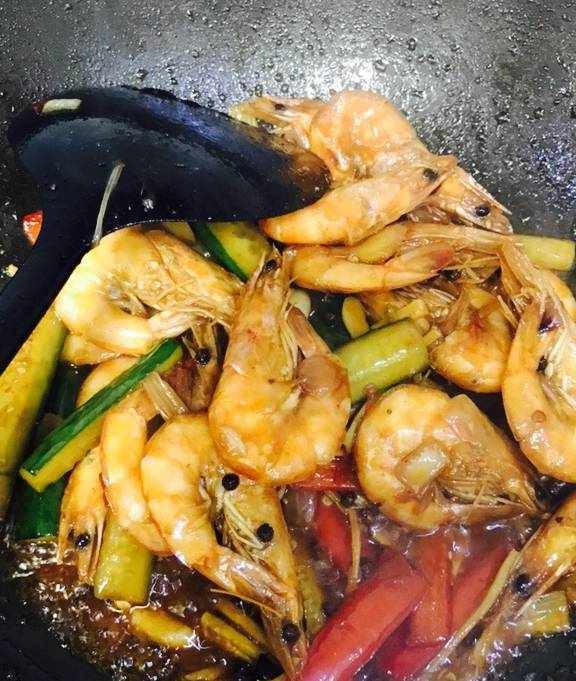 5.接著把對蝦也放進去一起翻炒,放入生抽和白糖和胡椒粉一起翻炒均勻放
