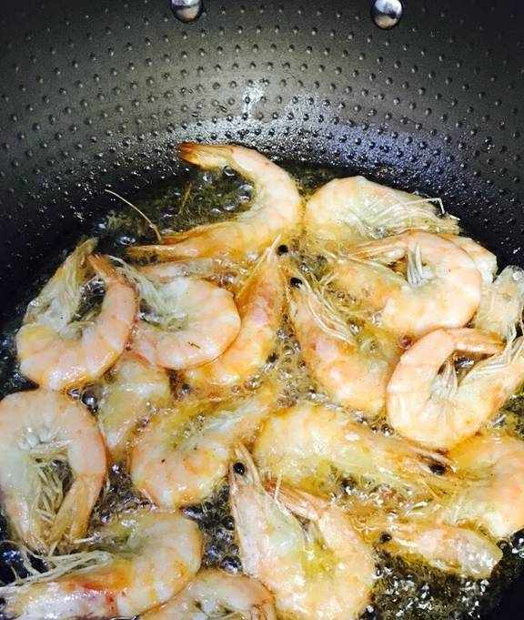 2.在鍋裡放入適量的油,開小火燒熱,然後把對蝦放進去炸到表面金黃就可以關火撈出瀝幹油備用瞭