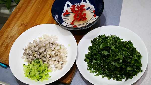 2、準備配菜:平菇洗凈切丁備用;青蘿卜也切成小丁備用;蒲公英葉子切細後備用;一把枸杞用溫水泡一下。