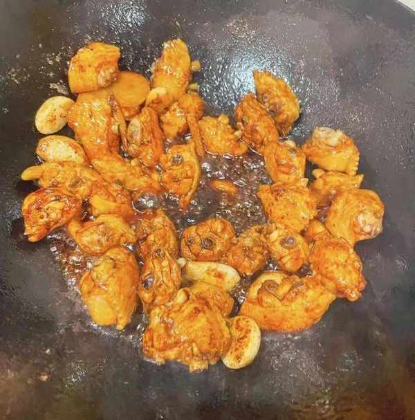 5:鍋裡倒油,放入白冰糖炒糖色,然後將雞塊稍微煎一下,然後放入適量生抽調味。