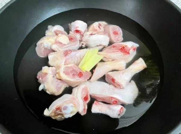 3:冷水下鍋,放少許薑片將雞肉焯下水,煮出浮沫兒。