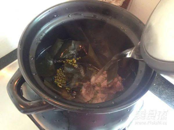 4、再把泡好的綠豆一起放入燉鍋中,加入適量清水,文火慢燉2個小時,再加食鹽調味即可出鍋開喝。