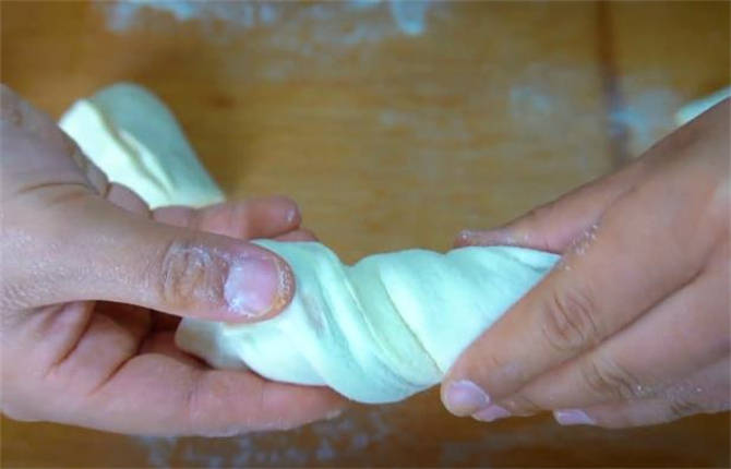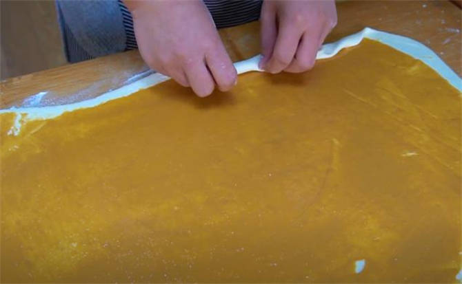 3.面團現在已經發好瞭,案板上撒一些幹面粉,排一下氣,搟成一張長方形的餅皮,搟好之後抹上一層芝麻醬,抹勻之後從底部卷起來。
