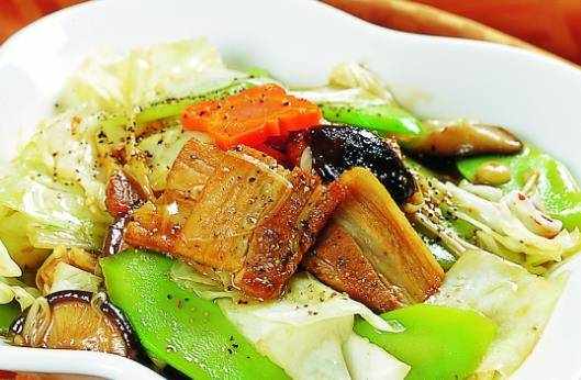 黑椒五寶蔬炒咸豬肉:咸豬肉洗去外表醃料切薄片備用,鍋熱入油放入蒜片辣椒炒香。放入咸豬肉片炒時加些米酒炒至肉呈焦黃感後,入芹菜炒,再加入各色彩椒炒,加入黑胡椒調味後即可起鍋。味道鮮香,令人回味無窮。