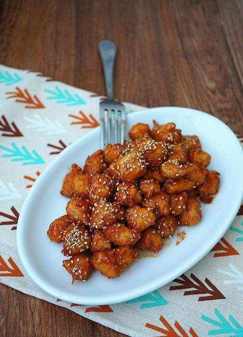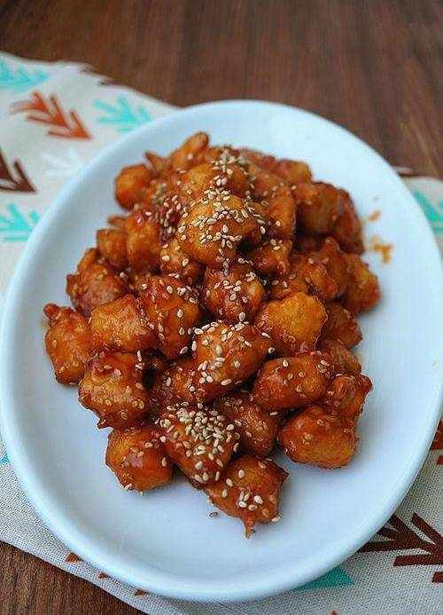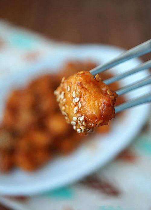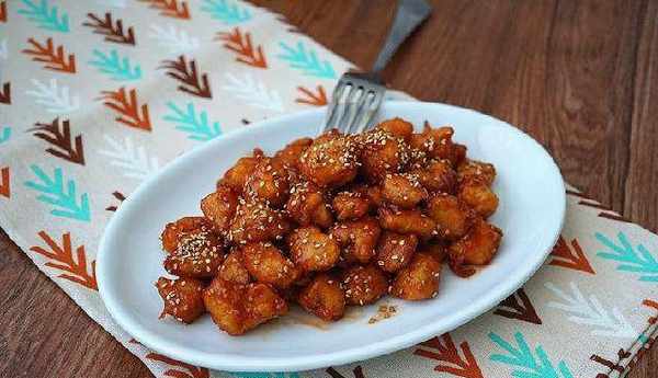 5、炒鍋燒熱加入多一些的植物油,分次下入裹瞭糊糊的雞肉炸至表面金黃。